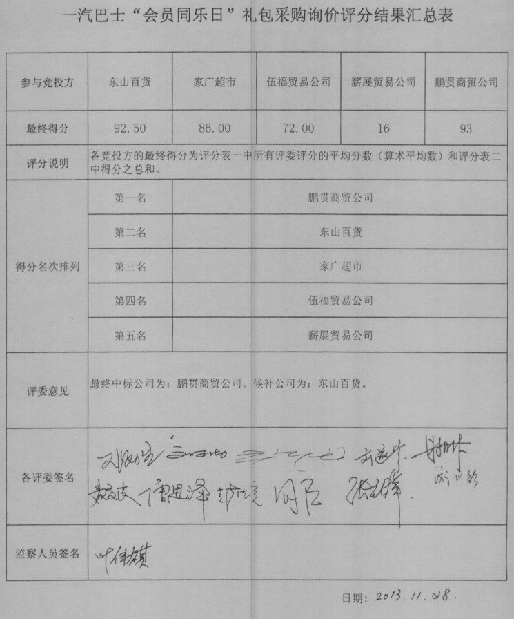 一汽巴士“會員同樂日”禮包采購詢價評分結果匯總表
